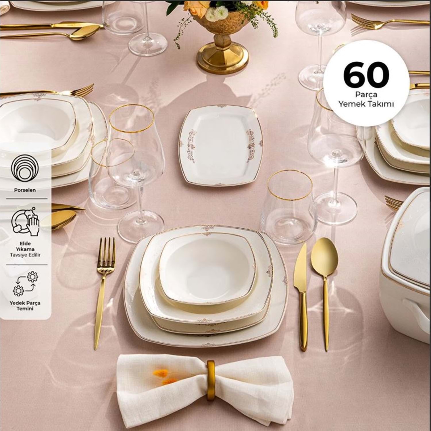 Emsan Bone Yeni Mimoza 12 Kişilik Yemek Takımı 60 Parça Yarım Kare